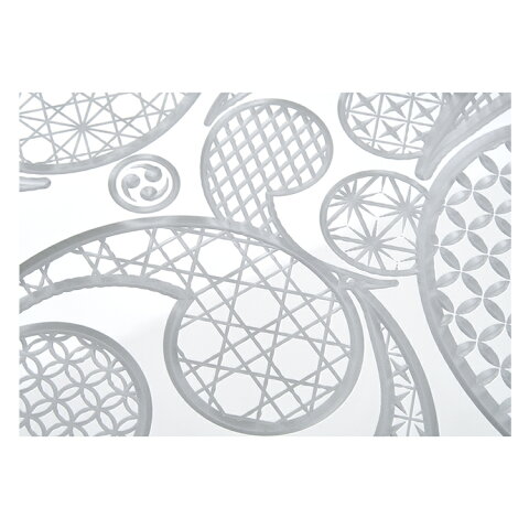 【麻の葉つなぎ】 麻の葉を均等に正六角形に並べ、隣り合い重なり合う葉が時に星形を、時に円を描く不思議な文様。