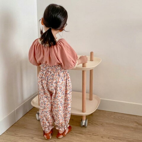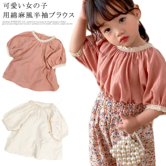 可愛い女の子用綿麻風半袖ブラウス首回りと袖口ギャザー寄せてレース付けデザイン後襟ぐり着脱しやすいスリットデザイン綿麻混素材で快適な着心地シンプルでコーディネートしやすいデイリーから通園通学まで沢山シーンご利用頂けます。