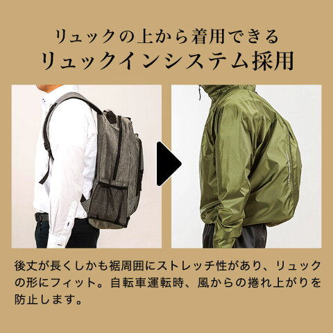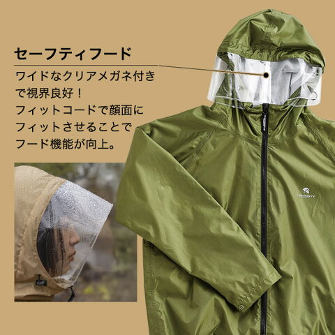 耐水圧10000mmH2O 透湿度3000g/m2/24h以上・裏生地に、マイクロメッシュ採用(通常のものよりメッシュの目が細かく肌触りがいい)肌にまとわりつきにくい!・縫製部裏側にシームテープ加工(水漏れ防止)・リュックの上から着用できる「リュックインシステム」を採用・セーフティフード:ワイドなクリアメガネ付きで視界良好。