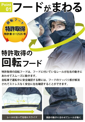 ) 商品説明文 回転フードで左右の確認がしやすい、リュックを背負いながら着用できるヘルメット対応のレインウェアの上下セットです。