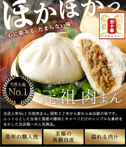 保存方法冷凍か冷蔵販売者元祖 五十番 神楽坂本店 昭和32年から変わらぬ伝統の肉まんふっくらとした生地と国産の豚肉とキャベツだけのシンプルな素材を生かした当店随一の人気商品。