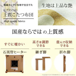 ■商品説明 日本製、住江織物上質生地の北欧デザインこたつ布団 楢材の天然木使用、薄型石英管ヒーターの折れ脚こたつテーブル 高さを調節できる継ぎ足付きで、好みの高さに2段階調整 折りたたみ式なので、未使用時コンパクトに折り畳みコンパクトに収納 高級カーテン生地で仕立てた、上質なこたつ布団 中綿には繊維内部に暖かい空気をためる中空綿を使用し、 裏地にはベロア素材を使っているので、ふわふわで柔らかい♪