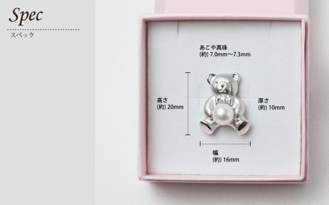 あこや真珠クマモチーフタイタックピンブローチ 真珠の種類 あこや真珠 真珠のサイズ 約7mm(7mm以上7.3mm未満) 真珠の色 ホワイトピンク系 真珠の形 ラウンド 金属素材 SV925 サイズ 縦 (約) 20cm × 横 (約) 16cm 厚 (約) 10mm その他 真珠は自然のものなので、小さいキズなどが若干みられる場合がございます。