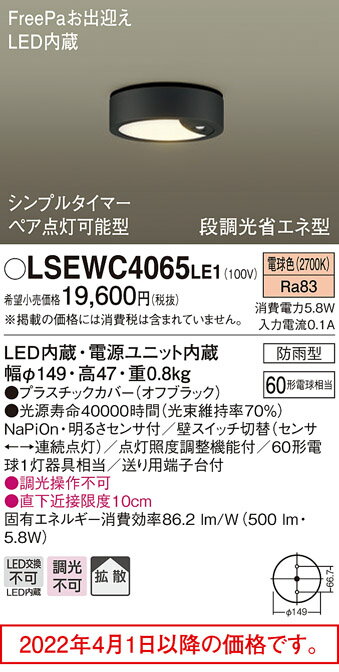 LED(電球色)防雨型LED内蔵電源ユニット内蔵LED(電球色タイプ)WΦ149・H47●NaPiOn・明るさセンサ付●壁スイッチ切替(センサ←→連続点灯)●点灯照度調整機能付●対象負荷:同じセンサ器具1灯まで●調光操作不可●直下近接限度10cm