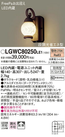 カテゴリ:照明器具 エクステリア ポーチライトメーカー:パナソニック Panasonic型番:LGWC80250LE1 lgwc80250le1明るさセンサ付・段調光省エネ型LED内蔵、電源ユニット内蔵、【ランプ】同梱包商品詳細光源◆LED(電球色タイプ)1個◆光源色温度:2700 K◆光源寿命40000時間(光束維持率70%)寸法・質量◆幅:140 mm◆高:310 mm◆出しろ:246 mm◆質量:1.8 kg仕様・注意事項◆電圧:100 V◆消費電力:5.2 W◆消費効率:30.8 lm/W◆器具光束:160 lm◆デザイン分類:Villa Resort◆【ガラスセード】透明・乳白模様入り◆【アルミダイカスト】ダークブラウンメタリック◆Ra83◆密閉型◆NaPiOn・明るさセンサ付◆センサ可動範囲(全方向20度)◆点灯照度調整機能付◆60形電球1灯相当◆手造り品ですので寸法、および色味・模様が多少異なることがあります。