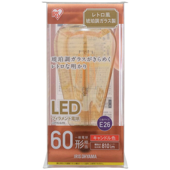 【2個セット】LEDフィラメント電球 led E26口金 おしゃれ シンプル かわいい レトロ風琥珀調ガラス製 60形相当 キャンドル色 LDF7C-G-FK 照明 灯り 電球 レトロ 北欧 60W インテリア キャンドル アイリスオーヤマ パック