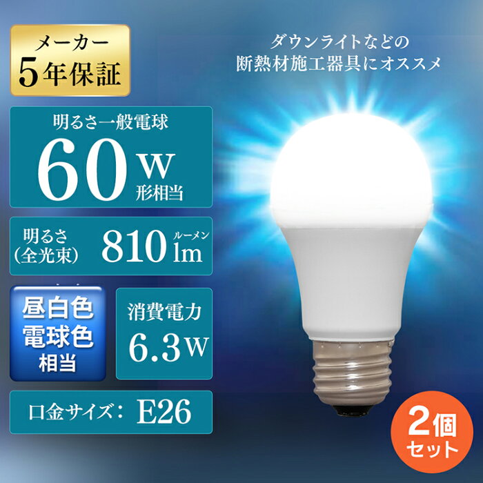 【2個セット】LED電球 E26 広配光 60形相当 昼白色 電球色★