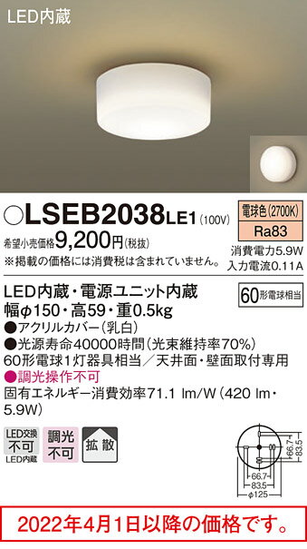 LEDシーリングライト60形(電球色)LSEB2038LE1(電気工事必要)(LGB51520LE1相当品)パナソニックPanasonic